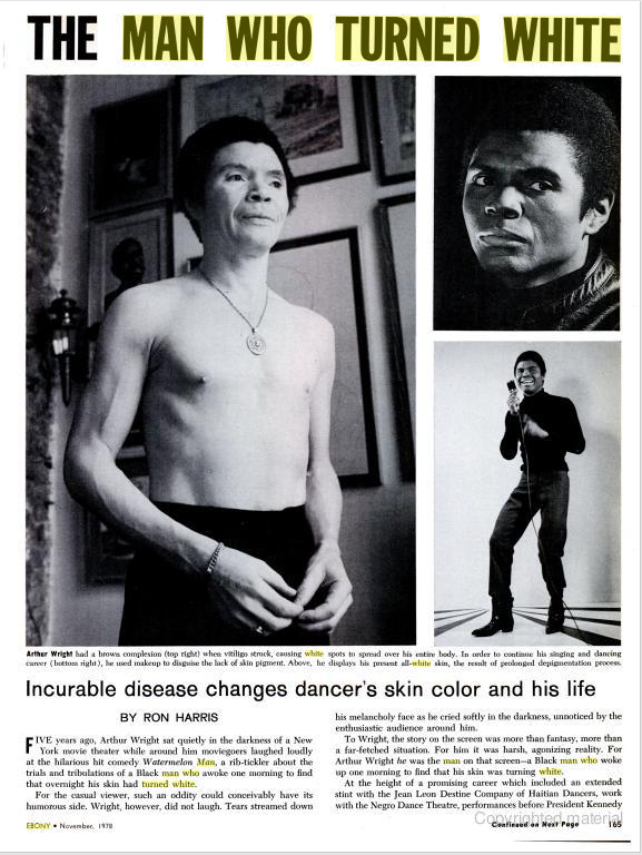 Vitiligo je bezbolan, ne utiče na druge delove tela i nije zarazan. Fiziološki gledano njegova šteta je minimalna, dok je psihološki poražavajuća. Pogotovo za crnog pacijenata. To upravo pokazuje slučaj Artura Rajta.