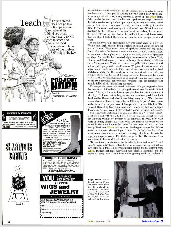 Na vrhuncu jedne obećavajuće karijere čija biografija uključuje nastupe sa „Jean Leon Destine Company of Haitian Dancers, the Negro Dance Theater“ za predsednika Kenedija u Beloj Kući, na Brodveju, u mjuziklima, azijskim i evropskim plesnim turama, Rajt je postao žrtva vitiliga. Kao i mnogi vitiligo pacijenati počeo je da gubi samopouzdanje i samopoštovanje kako je vitiligo postepeno uzimao maha.